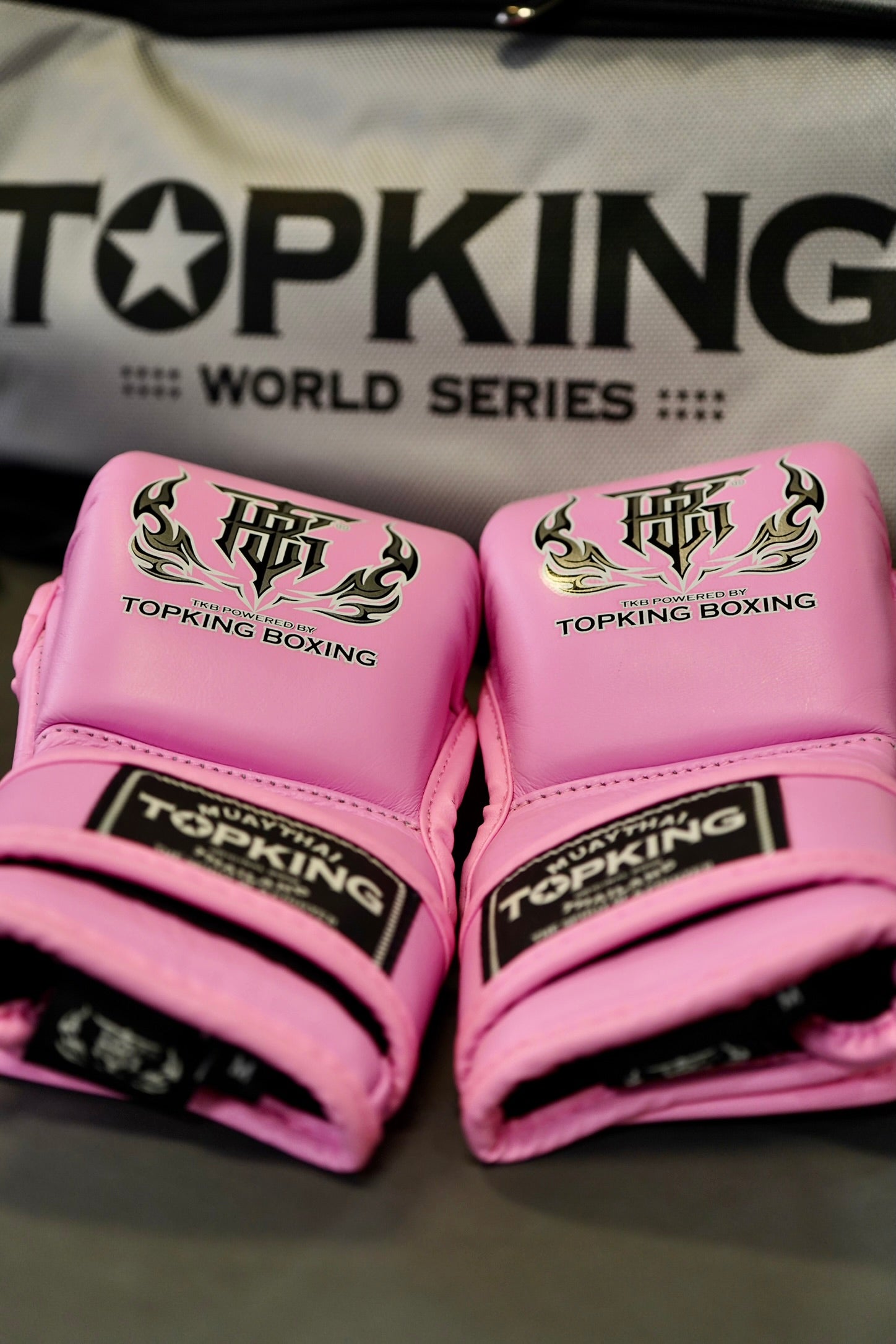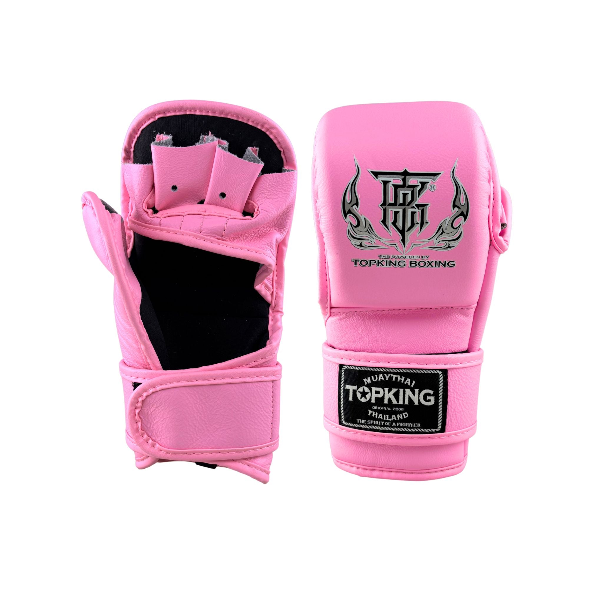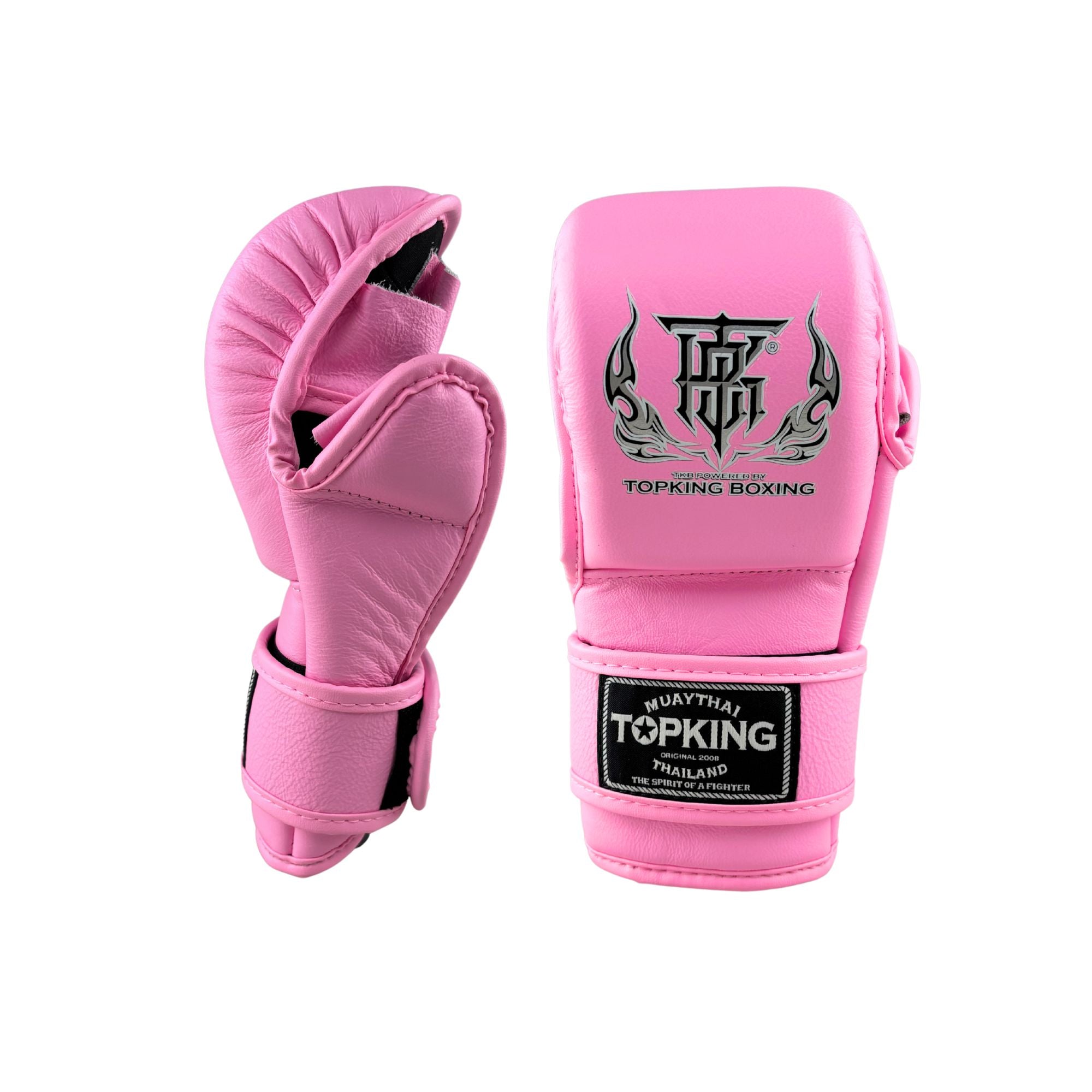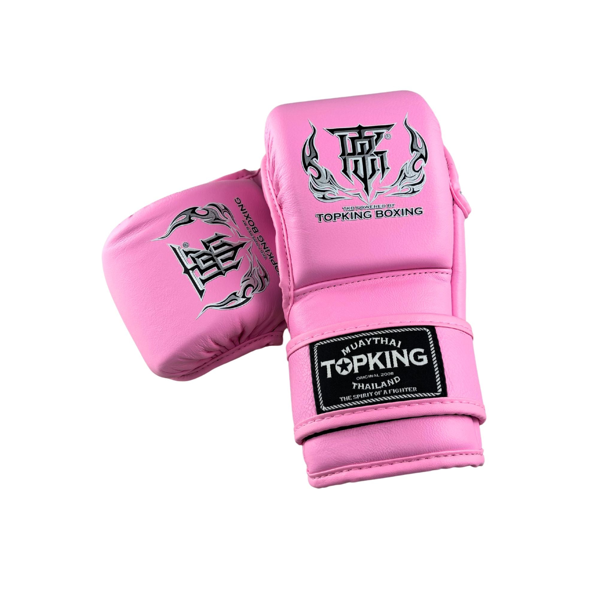 Top King 'Combat' Pink MMA Gloves with thumb protection. The MMA glove has thicker padding which is suitable for light sparring. MMA Shin Guards available. Handmade made from genuine cow leather for durability. Used by Professional Muay Thai & MMA (UFC) fighters.