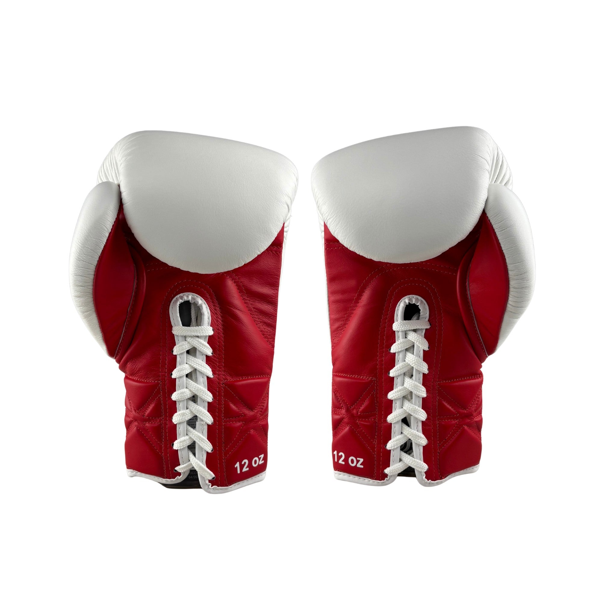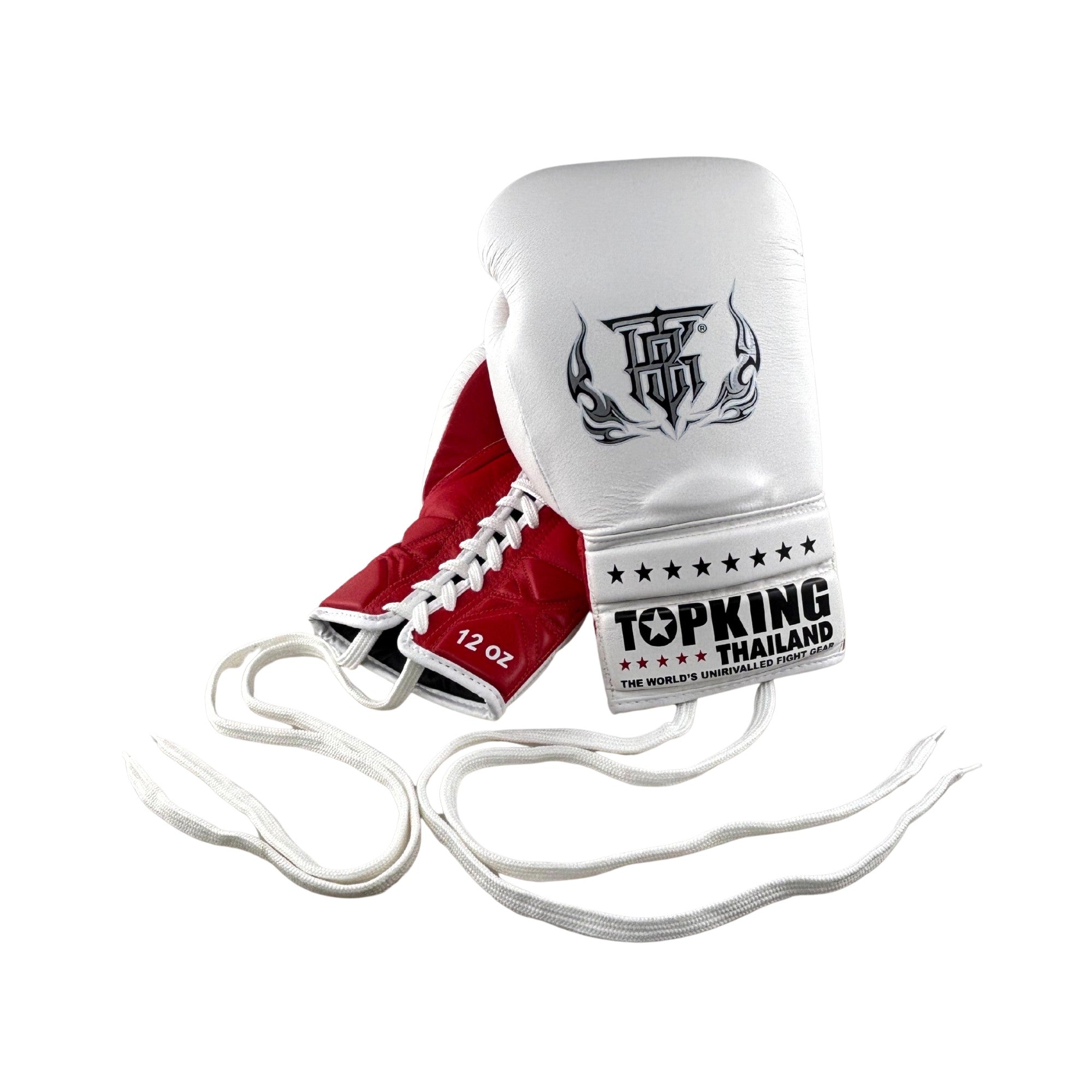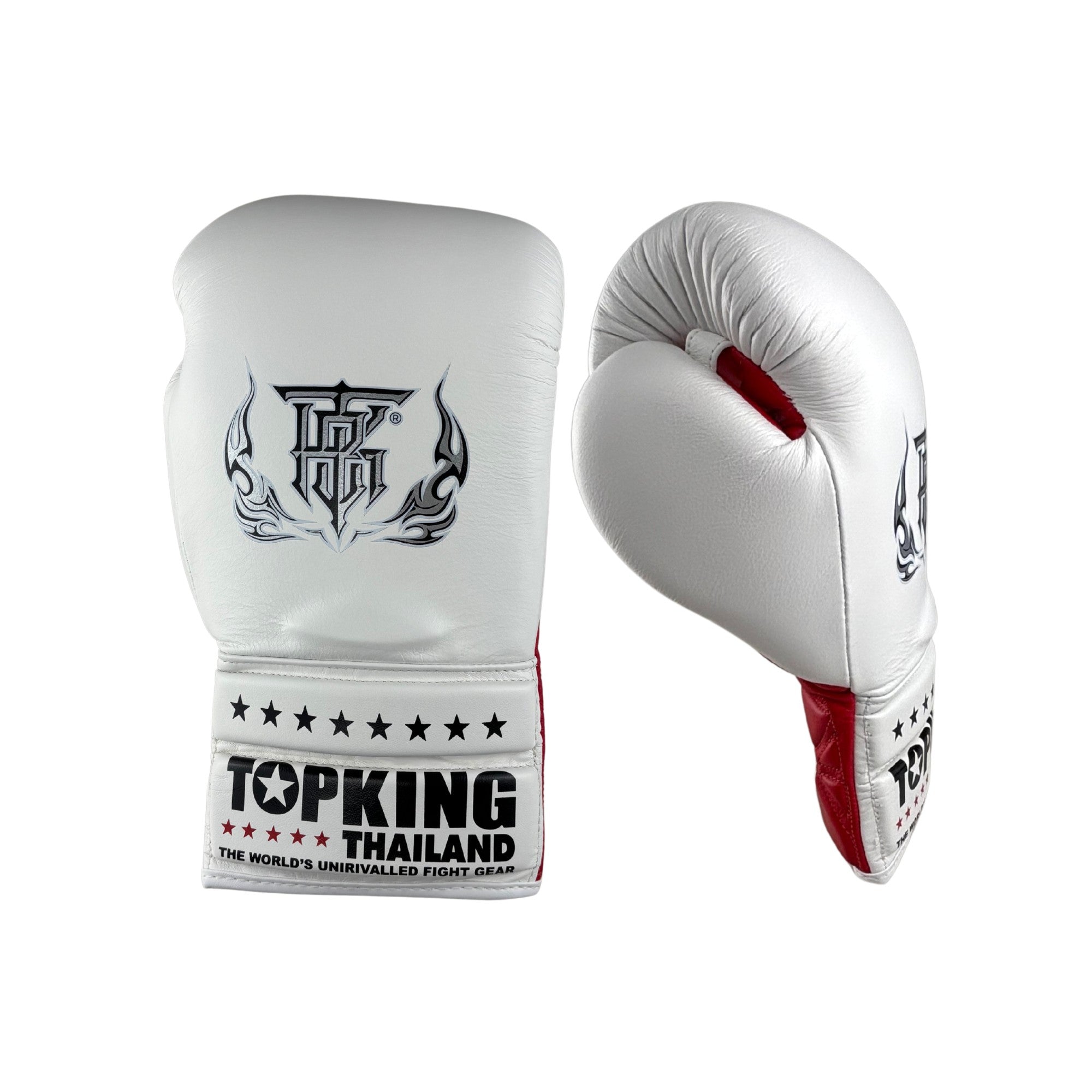 Top King Pro White & Red Lace-Up Boxing Gloves are professional competition gloves engineered specifically for use in Professional sanctioned fights.